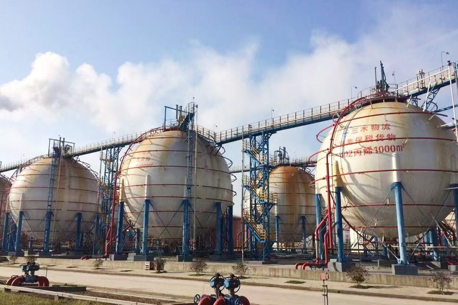 公司總投資6.5億元,目前已建成12.1萬m3化學品罐區(qū)(其中常溫壓力球罐2000 m314座、3000 m3球罐4座、1000 m3球罐1座;常壓拱頂罐5000 m312座、2000 m3拱頂罐10座)??捎糜诖鎯Ρ?、丙烷、正丁烷、異丁烷、C4、丙烯酸、丙烯酸丁酯、碳酸二甲酯、 丙三醇、氫氧化鈉溶液、乙醇、丙醇、丁醇、鄰二甲苯、二甲苯(混)、C9、 C10、芳烴溶劑油、 三氯甲烷、柴油等數(shù)十種危險化學品。